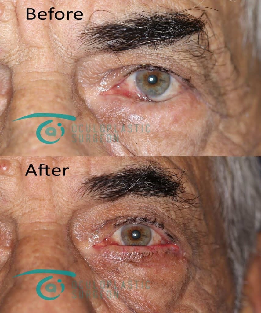 The eyelid margin rolls out, causing a red eye, tearing and discomfort. Sometimes the eyelid is also pulled down. Occasionally the cause of the ectropion is actually cancer. Surgery repositions the eyelid into the normal position.