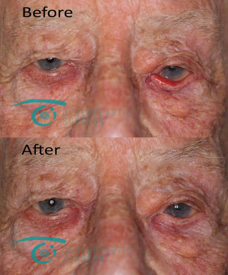 The eyelid margin rolls out, causing a red eye, tearing and discomfort. Sometimes the eyelid is also pulled down. Occasionally the cause of the ectropion is actually cancer. Surgery repositions the eyelid into the normal position.